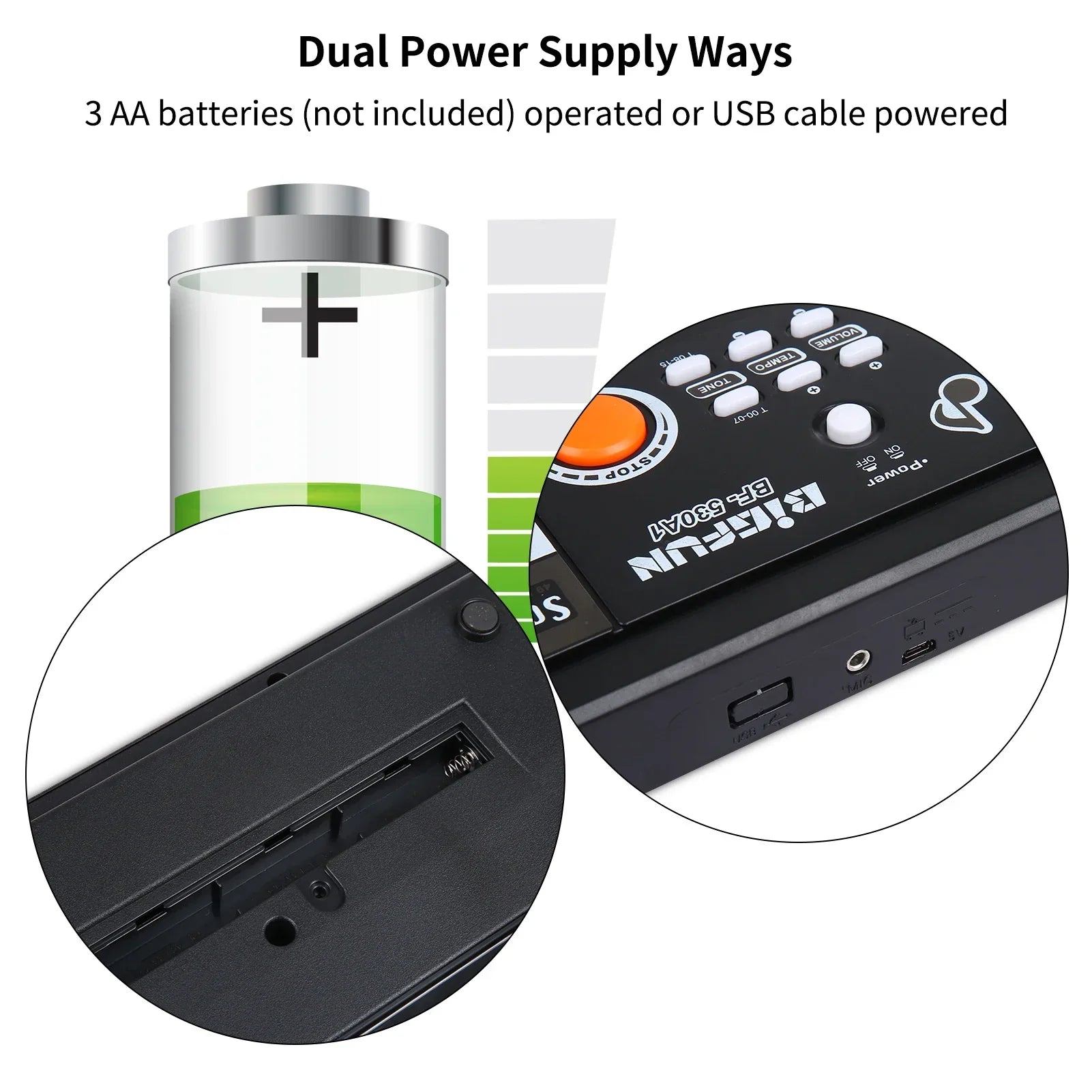 Multifunctional USB Electronic Organ: with a variety of built-in sounds and rhythms--16 tones, 8 rhythms, 6 demo songs, 5 percussion, it also has functions of volume control, tempo control, program, record, play/sound effect, one key for one note, fill-in, and single finger chord.